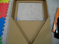 3. Kutunun arkasını resimde görüldüğü şekilde kesip kalan parçayı çıkarın. Aşağıda kalan üçgen parçaları yana açıp tiyatronun kendi başına ayakta durması için destek olarak kullanacaksınız.
