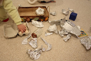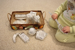 Bu oyun Geometrik Şekiller konulu BEO haftasına denk geldi. Değişik yaş grupları için değişik amaçlarla kullanılabilecek bir etkinlik. Aliminyum folyo ve evdeki değişik nesne veya oyuncaklar bu oyun için yeterli olacaktır. Önceden hazırlığınızı yapıp seçtiğiniz nesneleri aliminyum folyo ile sıkı bir şekilde kaplayın. Biçimleri belli olsun. Bir kısmı boş, bir kısmı salladığınızda ses çıkaran nesneler olabilir.