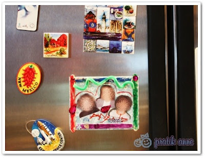 Mıknatısın üzerine Kıpırcan’ın seçtiği scrapbooking kağıtlarından birini fon olarak mıknatısa yapıştırdık. Çerçeve gibi olsun diye etrafına Kıpırcan’ın boyadığı dondurma çubuklarından koyduk. İçine resimleri koyup, sağına soluna pul, inci boncuk, tüy yerleştirdik.