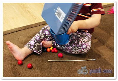 Burada Kımılnaz boncuk dizmeyi bırakmış, kendi çapında doldur boşalt yapıyor. Bir süre sonra tekrar boncukları dizmeye başladı. Onun boncukları sadece yuvarlak ama renkleri farklı farklı. İkinci çocuklar çok şanslı. Büyük kardeşlerini model aldıkları için, ilk çocukların ebeveynlerini taklit edip uygulamalarından çok daha kısa sürede öğrenip uygulamaya geçiyorlar.