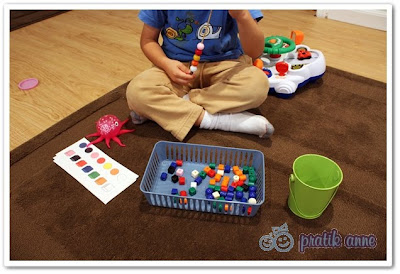 Kımılnaz hala daha basit dizme yaparken Kıpırcan için bir adım daha ileri gidip örnekli boncuk dizme etkinliği hazırladım.