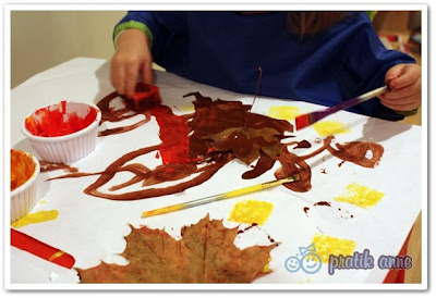 Evin önünde bir ağacımız var. Garibim çırılçıplak kaldı bile. Yerler de doğal olarak kuru yağrak dolu. Arada değişik renklerde yaprak toplayıp duruyorduk. Bunlarla baskı boya yaptık beraberce.