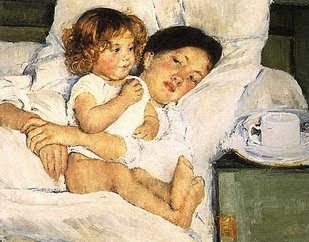 Resim: Mary Cassatt, Breakfast in Bed. En sevdiğim anne çocuk resmi.