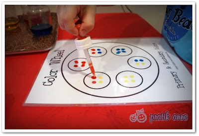 Kıpırcan ve Kımılnaz için renklerle ve sularla yapılacak birşey olsun da ne olursa olsun. Resimdeki renk tekerleği kağıdını Mama Jenn’in sayfasından indirip, bastırıp, lamine ettim. Buna benzer bir etkinliği ArchiSugar Montessori Eğitimi blogunda yayınlamıştı. Kavanozlara gıda boyası ile renkli sular hazırladım. Bir kere nasıl yapılacağını gösterdim ve gerisini çocuklara bıraktım. Ana renkleri karıştırınca hangi renkler oluşuyor, kendileri tecrübe ederek görebilirler. Fon müziğimiz (tesadüfen) Banu Kanıbelli‘nin Kar’a CD sinden 3. parça olan Renkler idi.