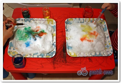 Önüm arkam sağım solum kar ama her dakika da dışarıda geçmiyor. Biz de karı eve getirdik. Gıda boyası katılmış sular ve enjektörler ve damlalıklarla karları boyadık. Bunu Jojebi’nin blogunda okuduğum fikirden uyarladım.